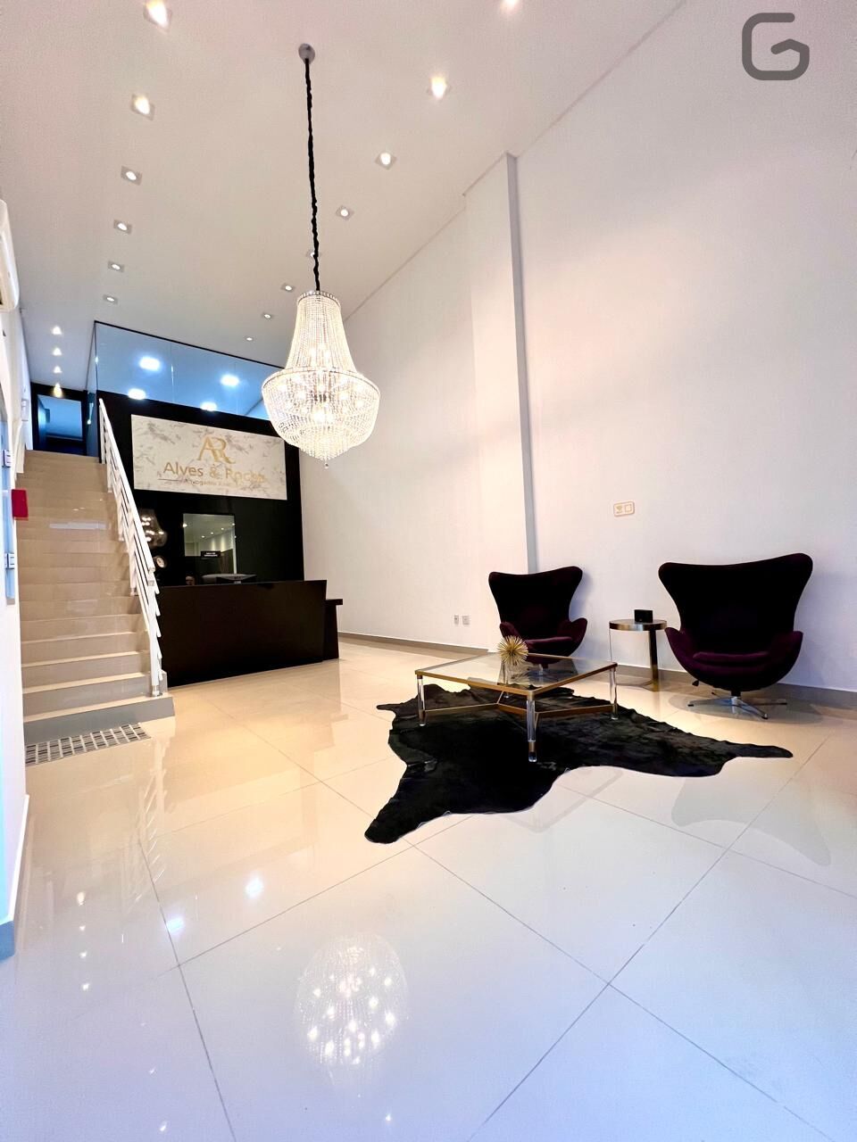 No piso térreo recepção com sala de espera, sala de reuniões, estação de trabalho, lavabo e uma sala menor.