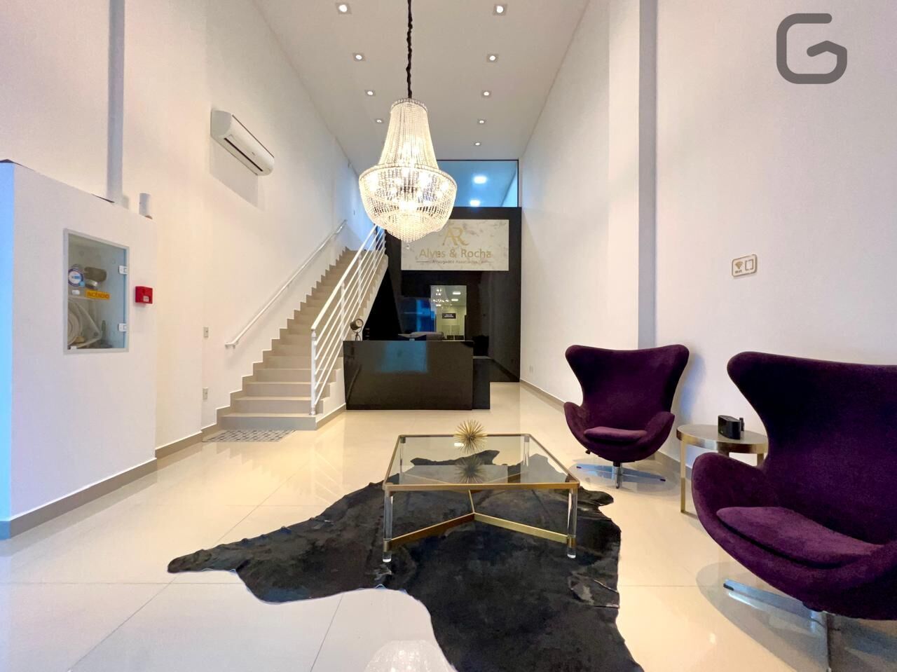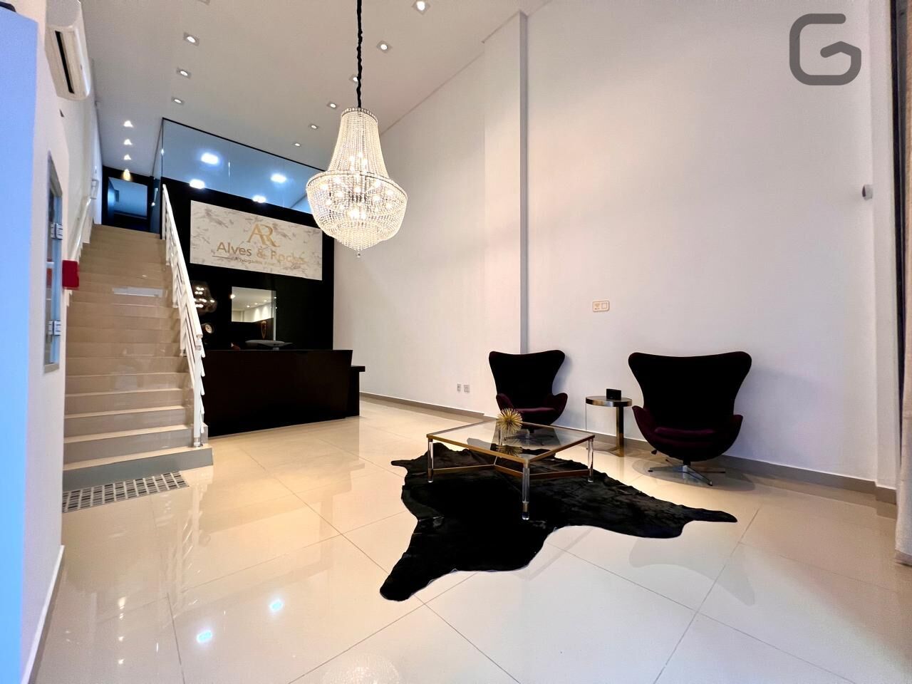 No piso térreo recepção com sala de espera, sala de reuniões, estação de trabalho, lavabo e uma sala menor.